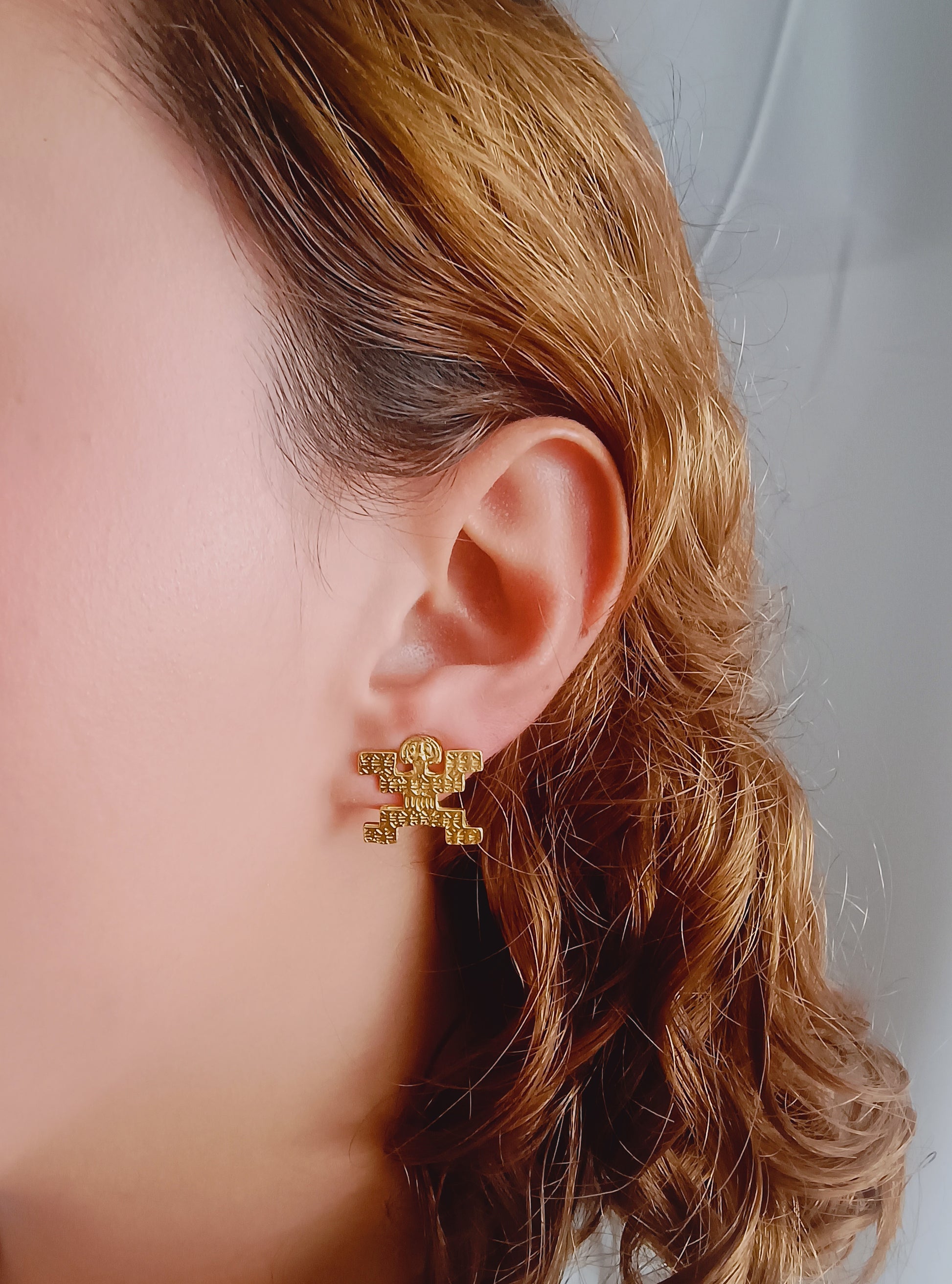 Inspirados en los antiguos pectorales dorados usados por los caciques-chamanes de la cultura Tolima, estos aretes representan la fusión sagrada entre el hombre y el jaguar —símbolo de poder, valentía y guía espiritual.